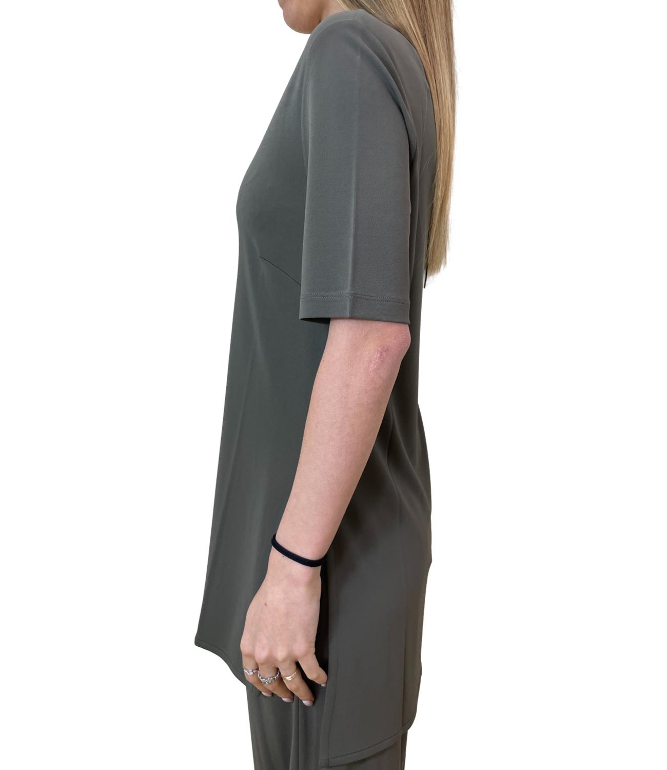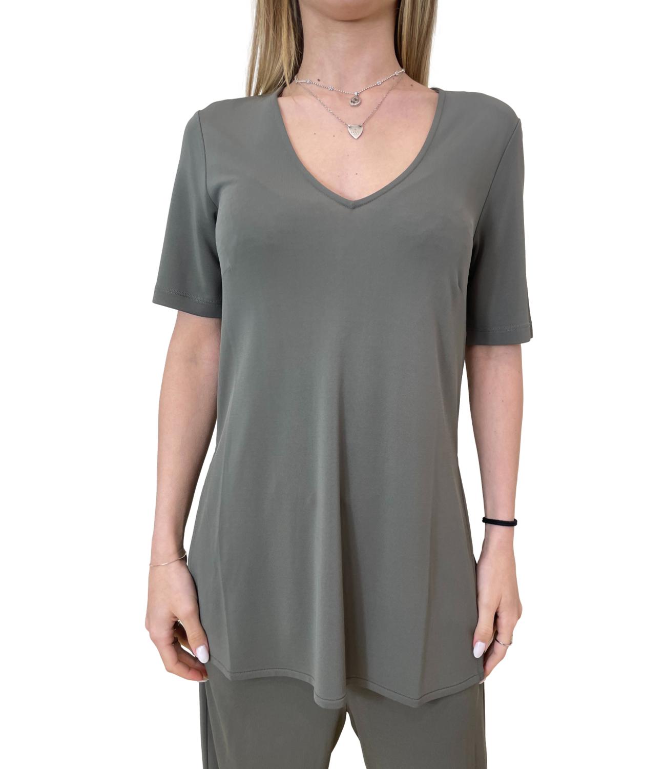 T-shirt a mezza manica con scollo a V e spacchi laterali. Taglio dritto più lungo sul retro
