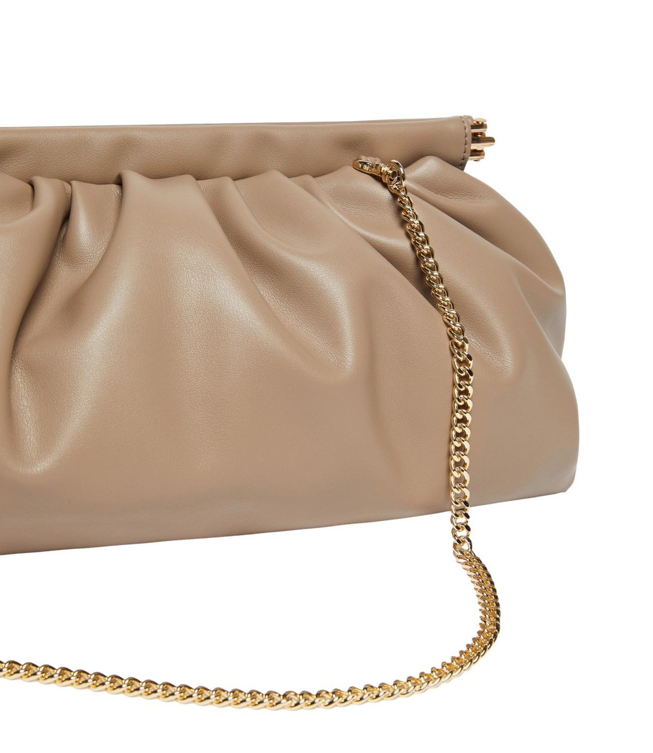 La pouch lucida cattura lo sguardo con il suo design morbido e il dettaglio brillante della catena dorata. Perfetta da indossare a mano in città, si abbina a cappotti e piumini aggiungendo una nota sofisticata alle tue mise.