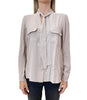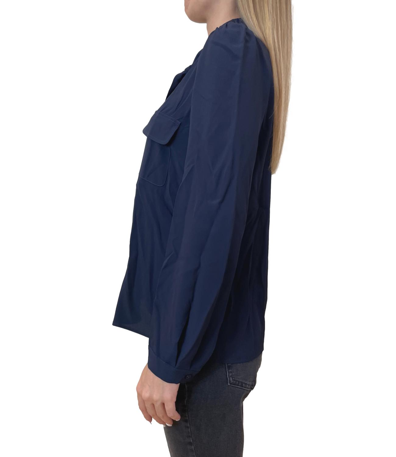 Camicia in crêpe de Chine di misto seta. Fit leggermente sfiancato. Scollo a V con sciarpina da annodare sul davanti. Abbottonatura a vista. Motivo di arricci sulla parte alta del giro manica. Fondo dritto stondato