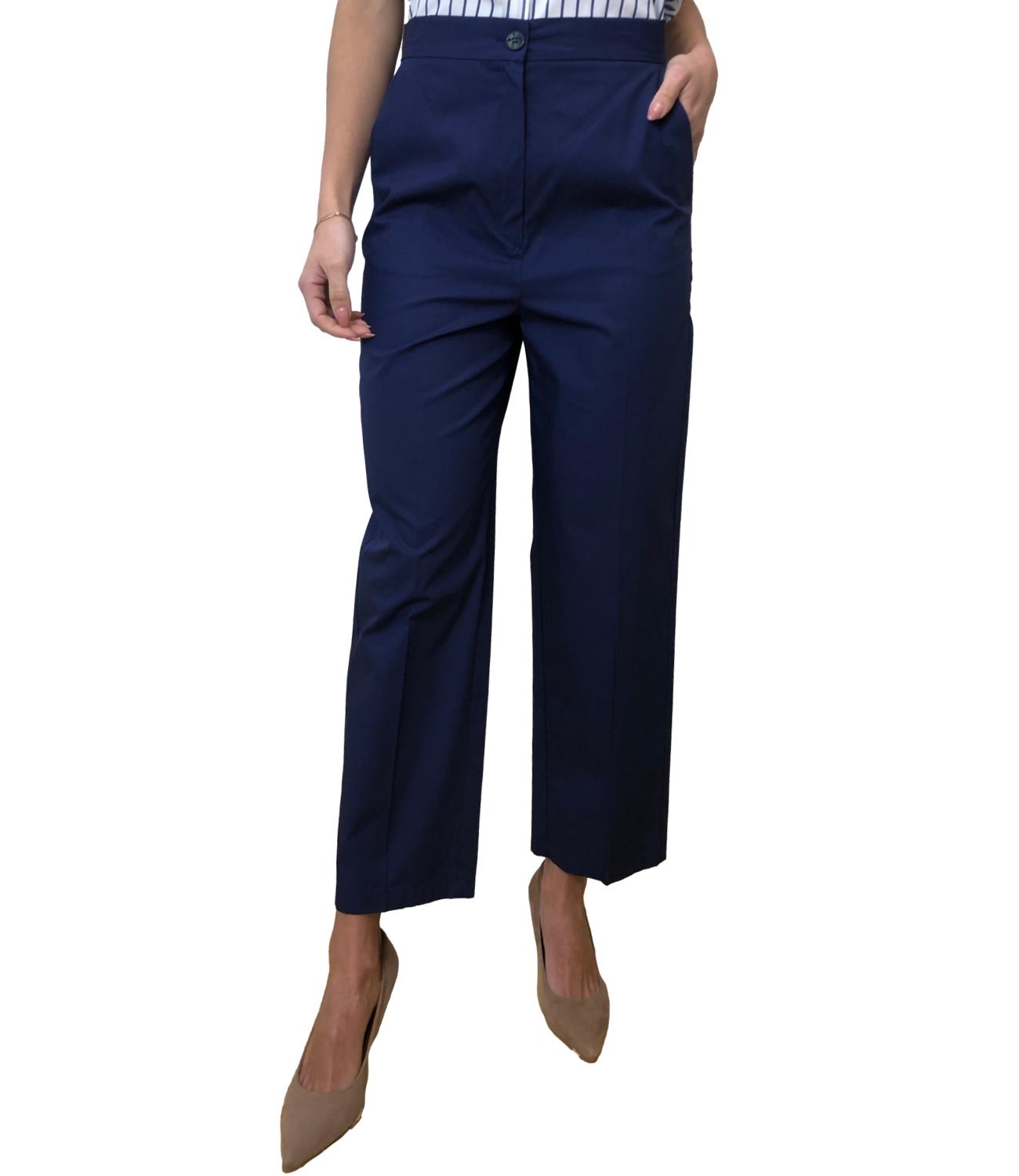 Pantalone dritto Trina di Emme Marella. Pantalone dritto a vita alta in popeline di cotone, lunghezza alla caviglia. Chiusura con cerniera e bottone. Tasche a filo laterali.
