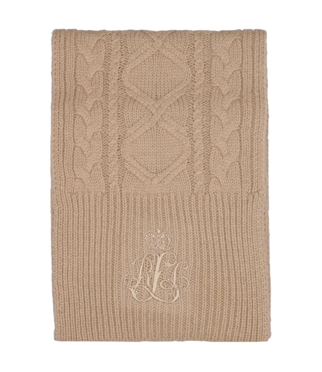 Sciarpa Ralph Lauren beige a trecce in misto lana con logo ricamato, sciarpa invernale calda da donna