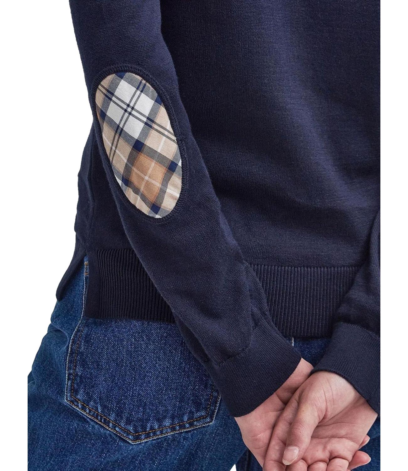 Blue cardigan with button front closure, long sleeves, and elbow patches.