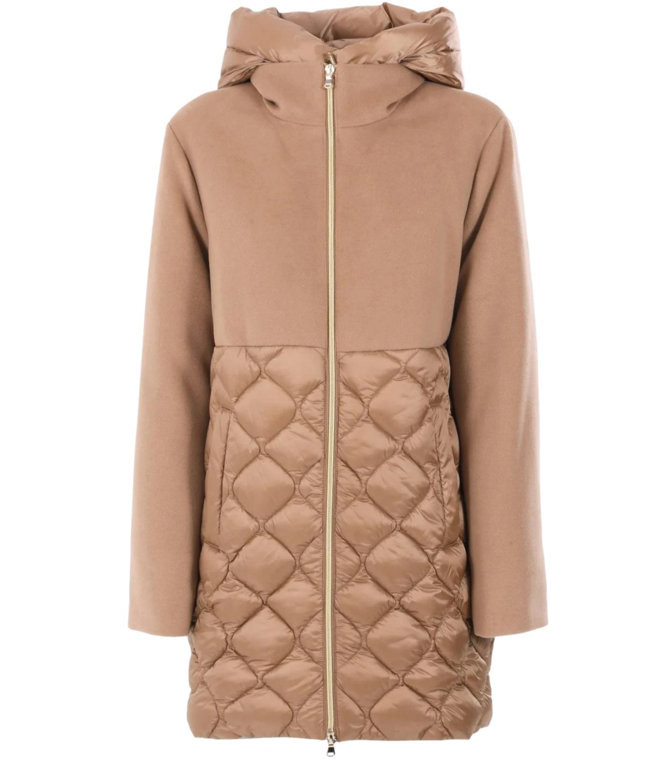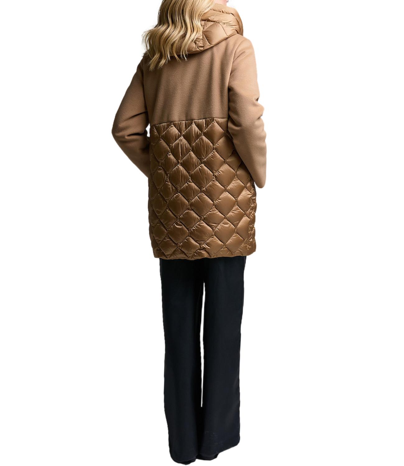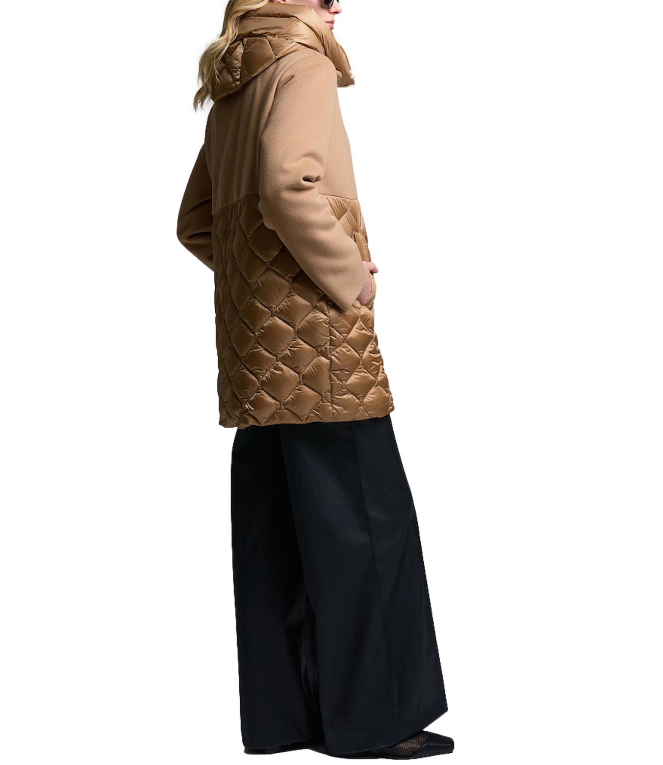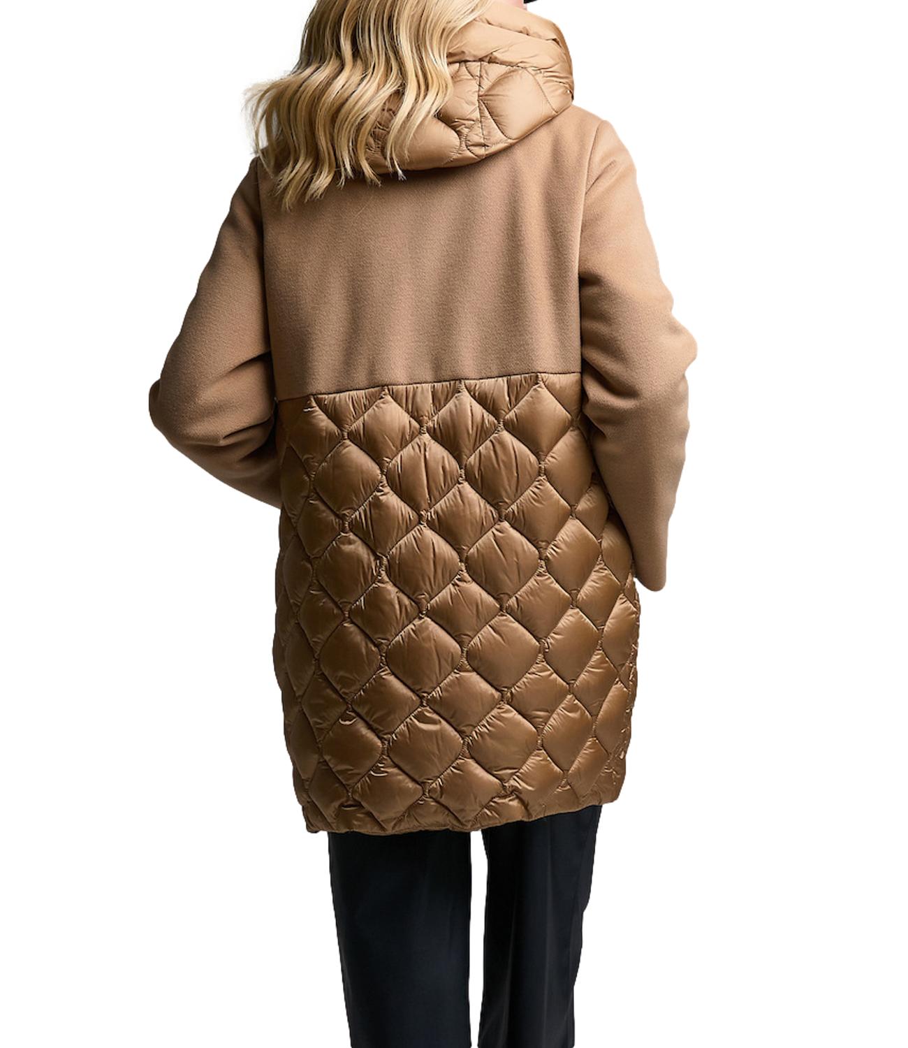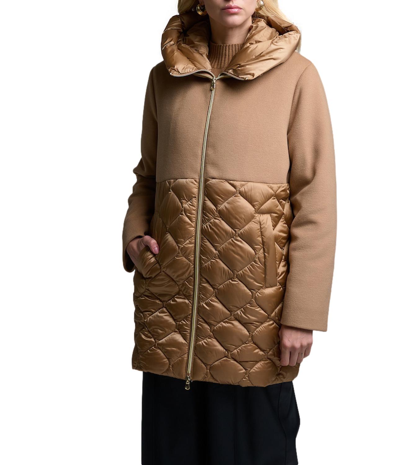 Piumino imbottito corto "Amore" color cammello con cappuccio e chiusura a zip. Modello con pannelli trapuntati a rombi nella parte inferiore e interno imbottito per calore e comfort.