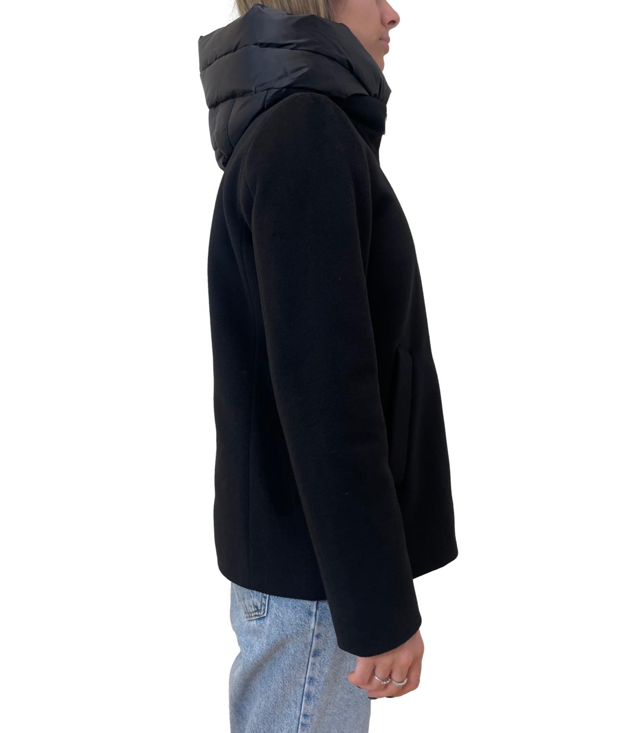 Compatto e trasformabile, questo giaccone in panno soft coniuga funzionalità e stile urbano. La pettorina e il cappuccio in tessuto antigoccia si possono rimuovere, svelando un design più essenziale.
