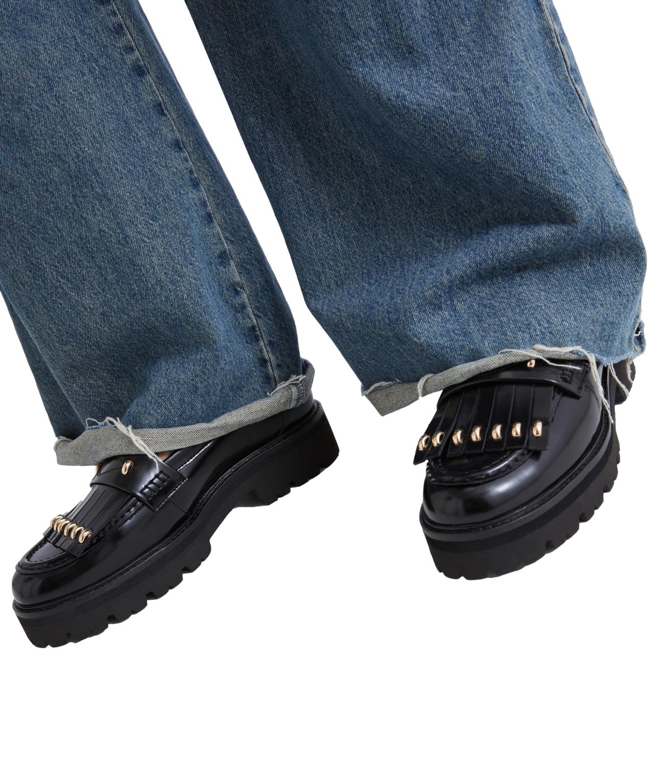 Collegiali di spirito e grintosi d'indole. I mocassini vanno a passo d'uomo, con le linee stondate sulla punta e il tocco scintillante delle micro borchie sulla frangia.