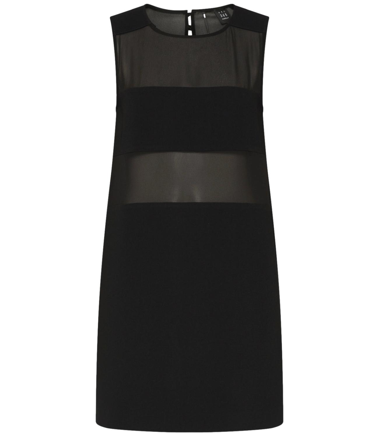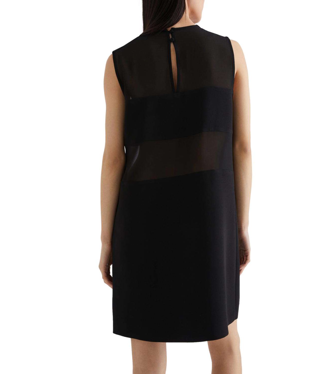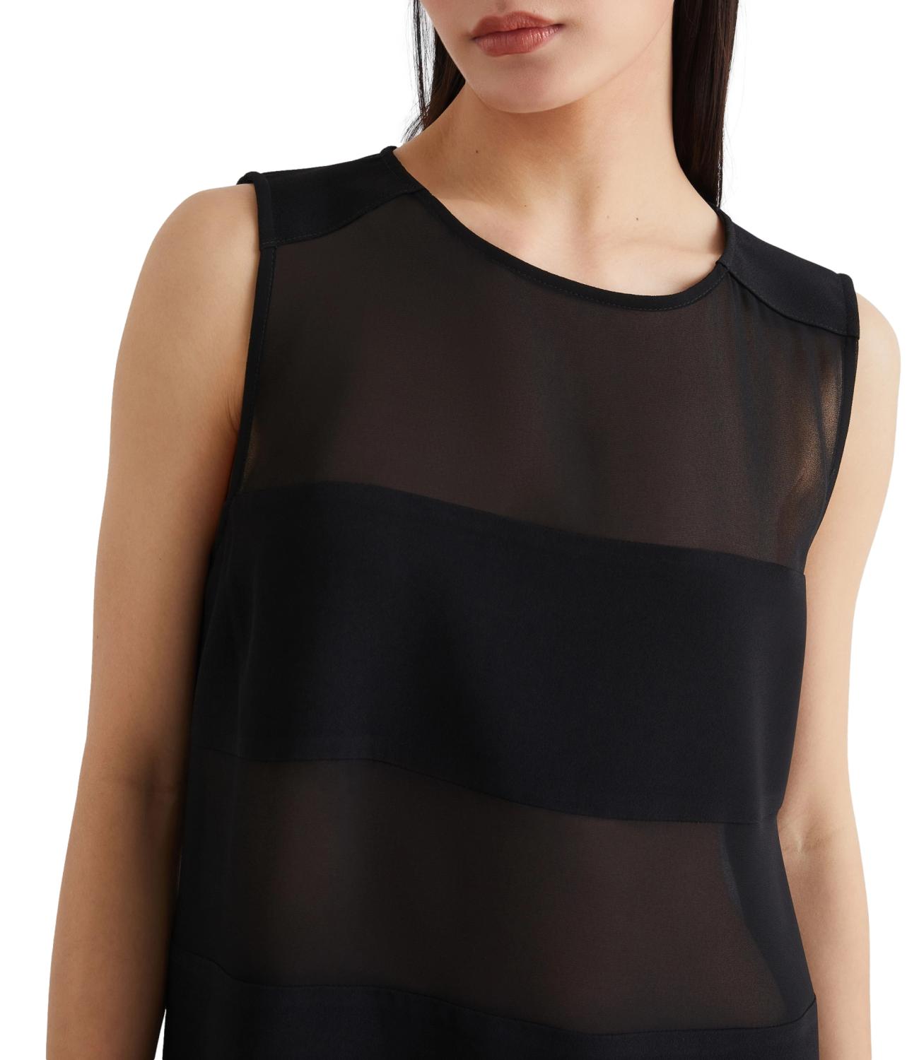 Essenziale nelle linee, sofisticato nei materiali: nuovo abito smanicato in envers satin, con pannelli orizzontali in georgette che creano un gioco sensuale di trasparenze sul busto.