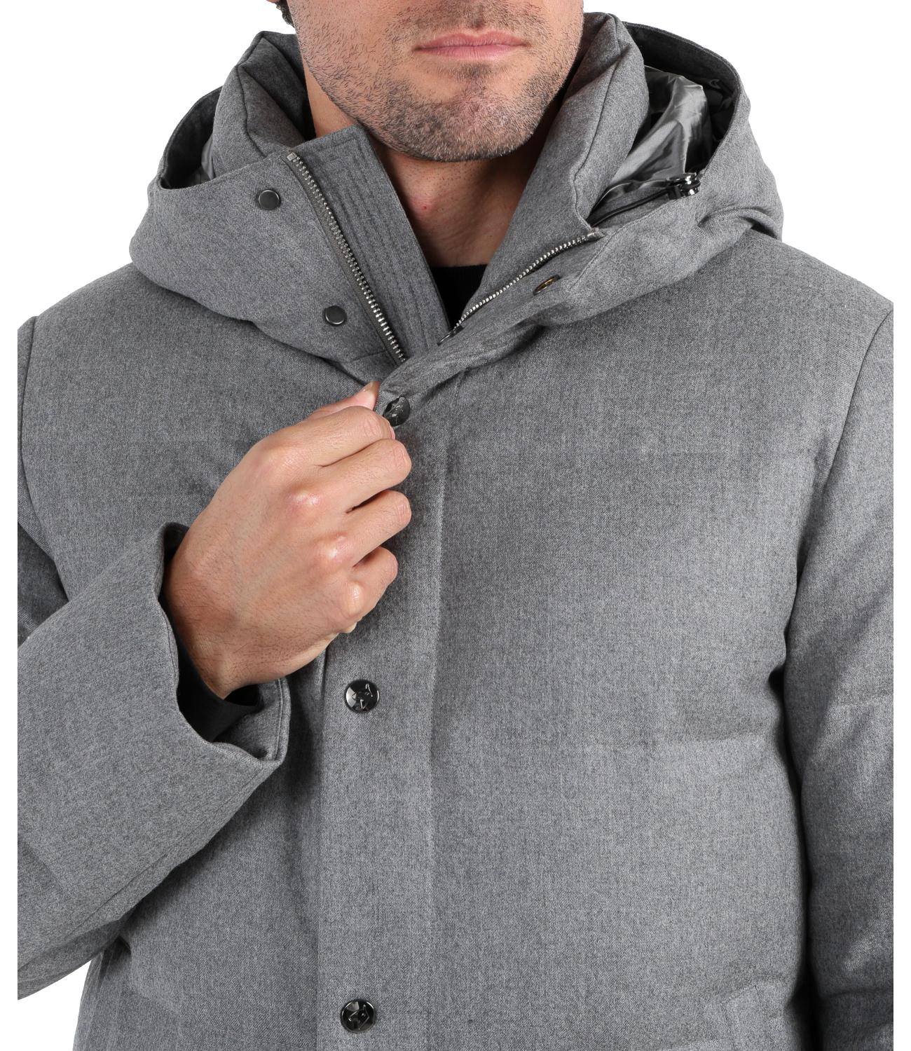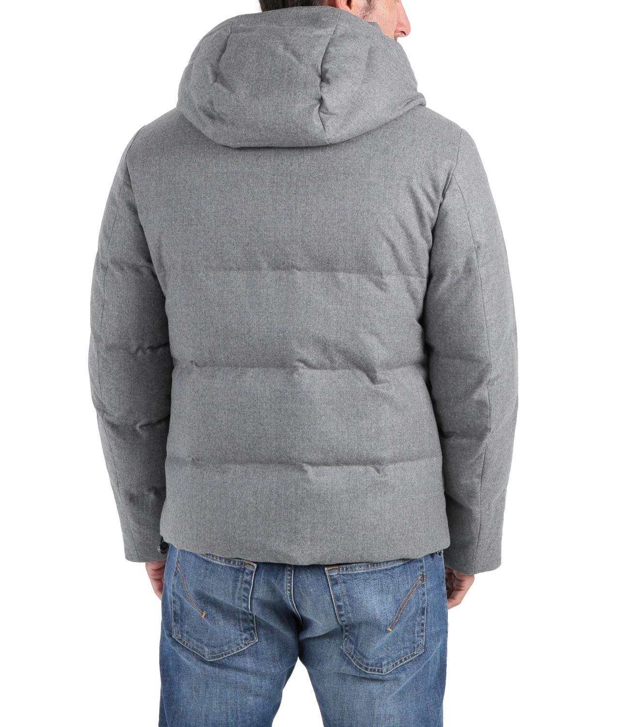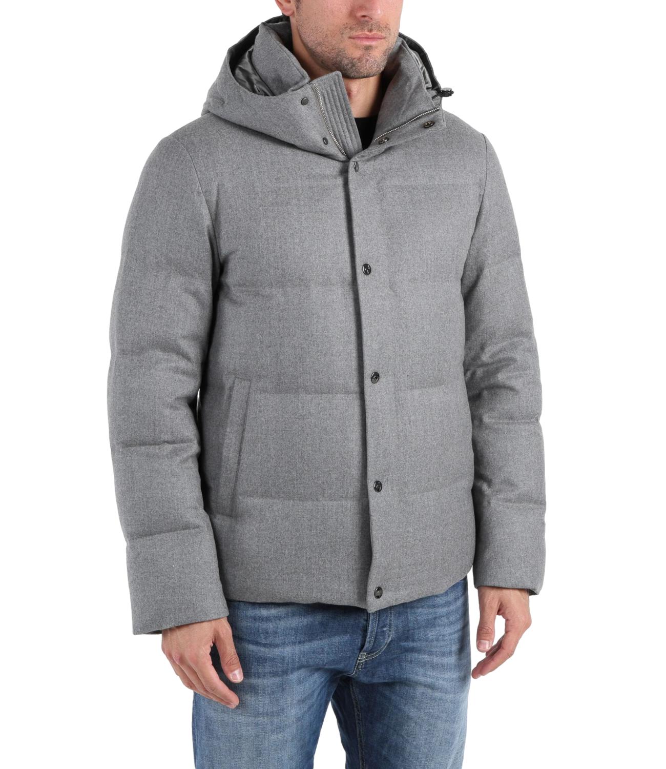 Questo piumino corto grigio combina stile, calore e funzionalità in un unico capo. Realizzato in panno di lana 100% WV, assicura un'eccellente protezione dal freddo mantenendo un aspetto raffinato. La chiusura con zip e bottoni automatici garantisce praticità e sicurezza, mentre il cappuccio fisso offre ulteriore riparo nelle giornate più rigide.